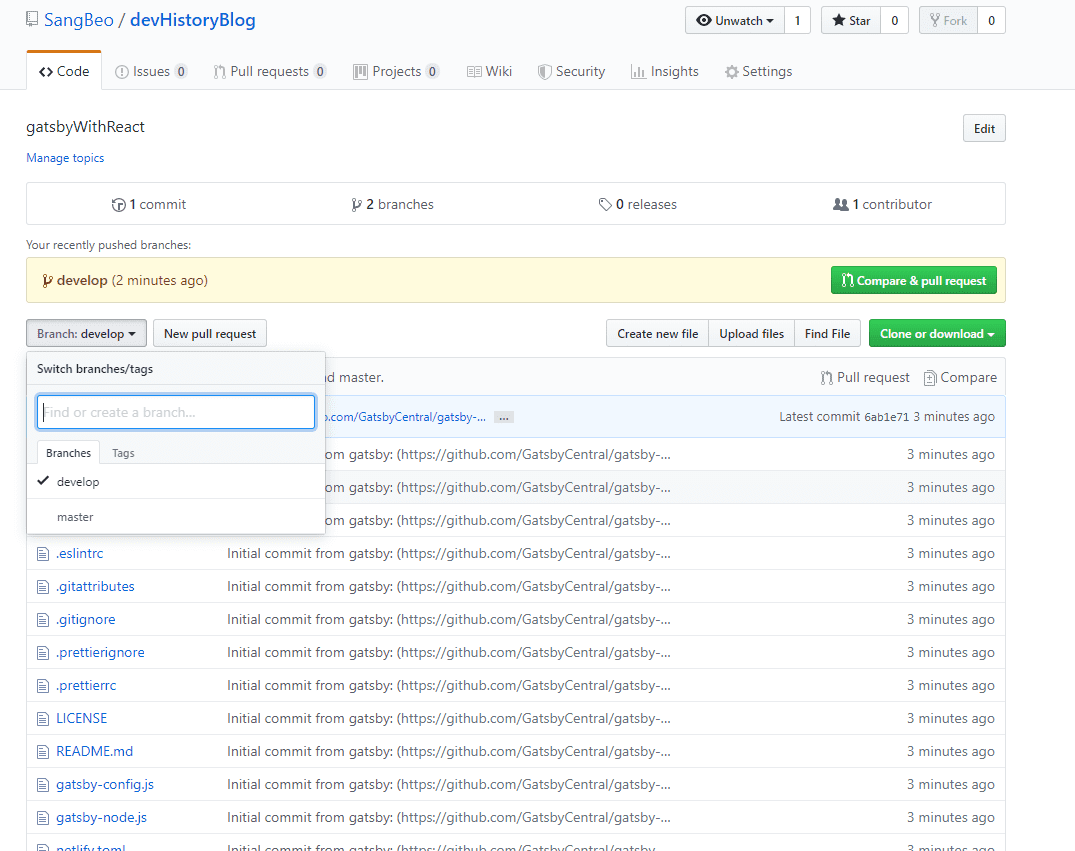 그래서 개발은 develop 브랜치에서 진행하고 master 브랜치는 gh-pages로 배포할때만 사용한다