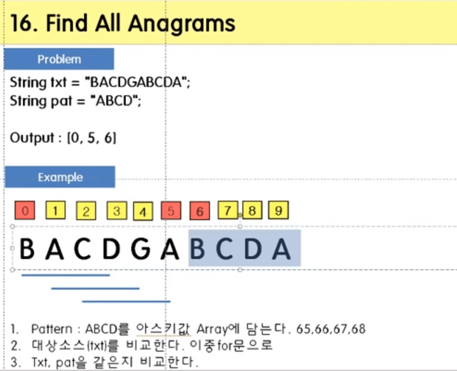 Assertions.assertArrayEquals(new int[]{0,5,6}, 아나그램_solution("BACDGABCDA", "ABCD"));
