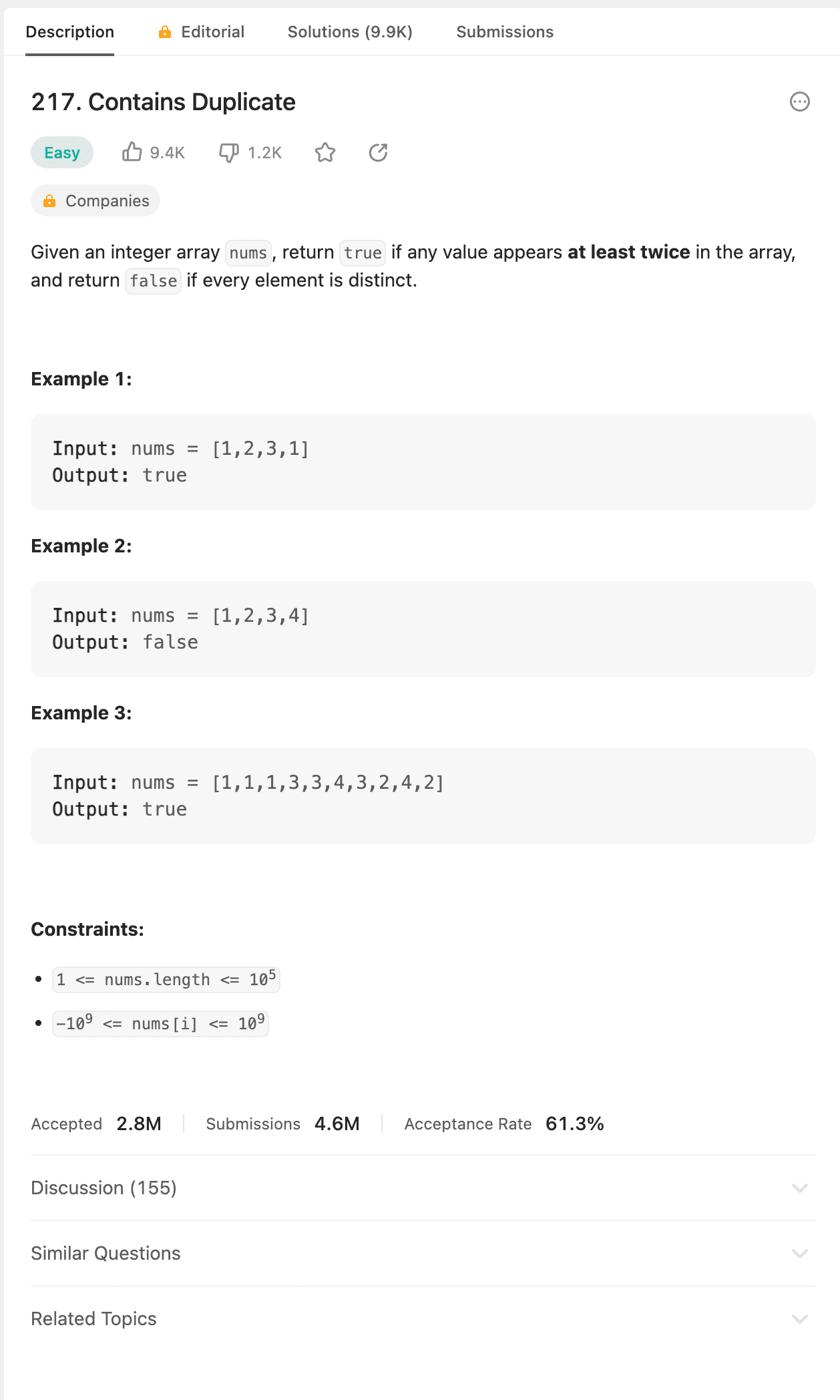 - input nums가 주어졌을때, nums 안에 같은 원소가 2개 이상 있을 경우 true, 아니면 false를 반환