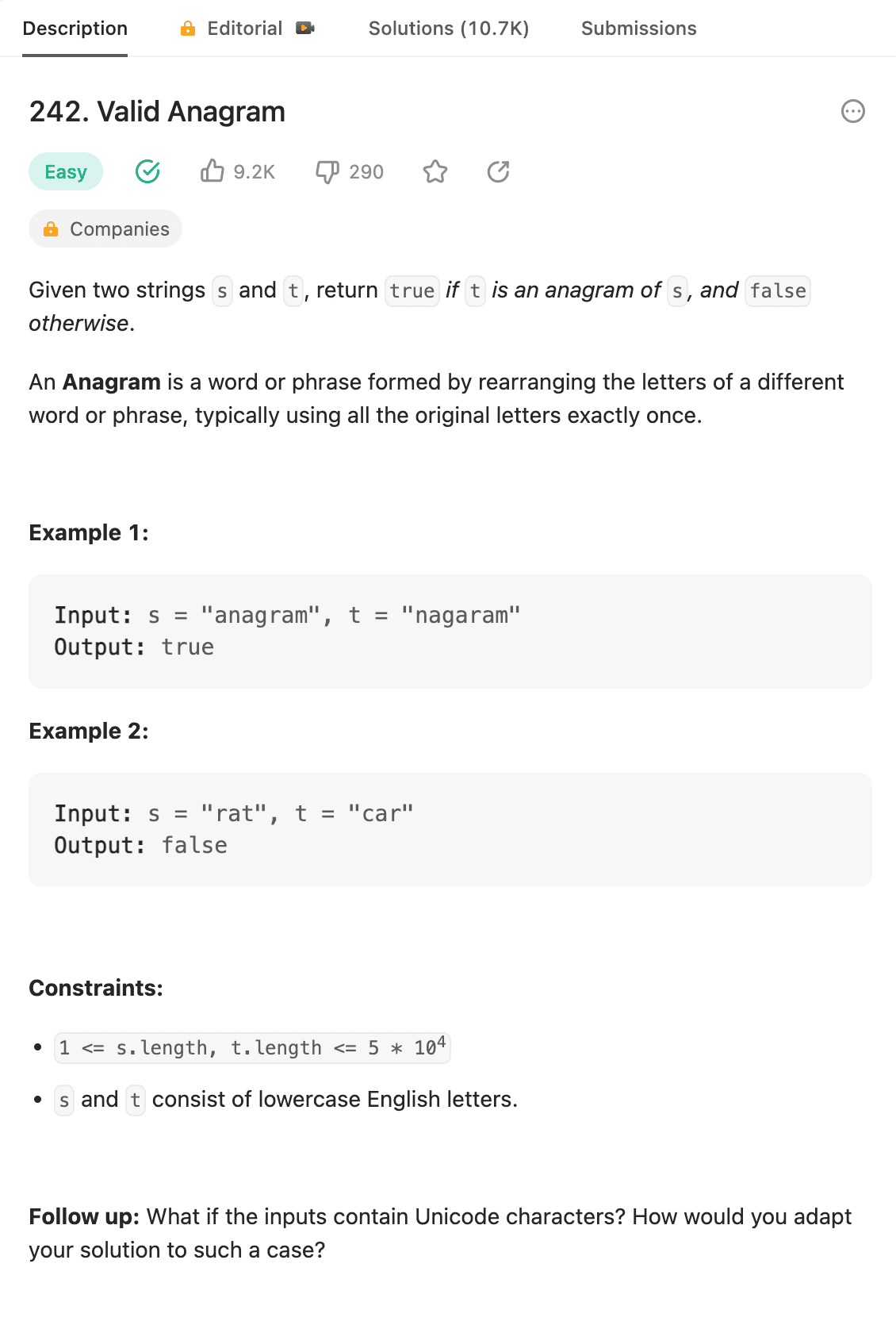 - s와 t가 주어졌을때, 아나그램일 경우 true, 아니면 false 반환