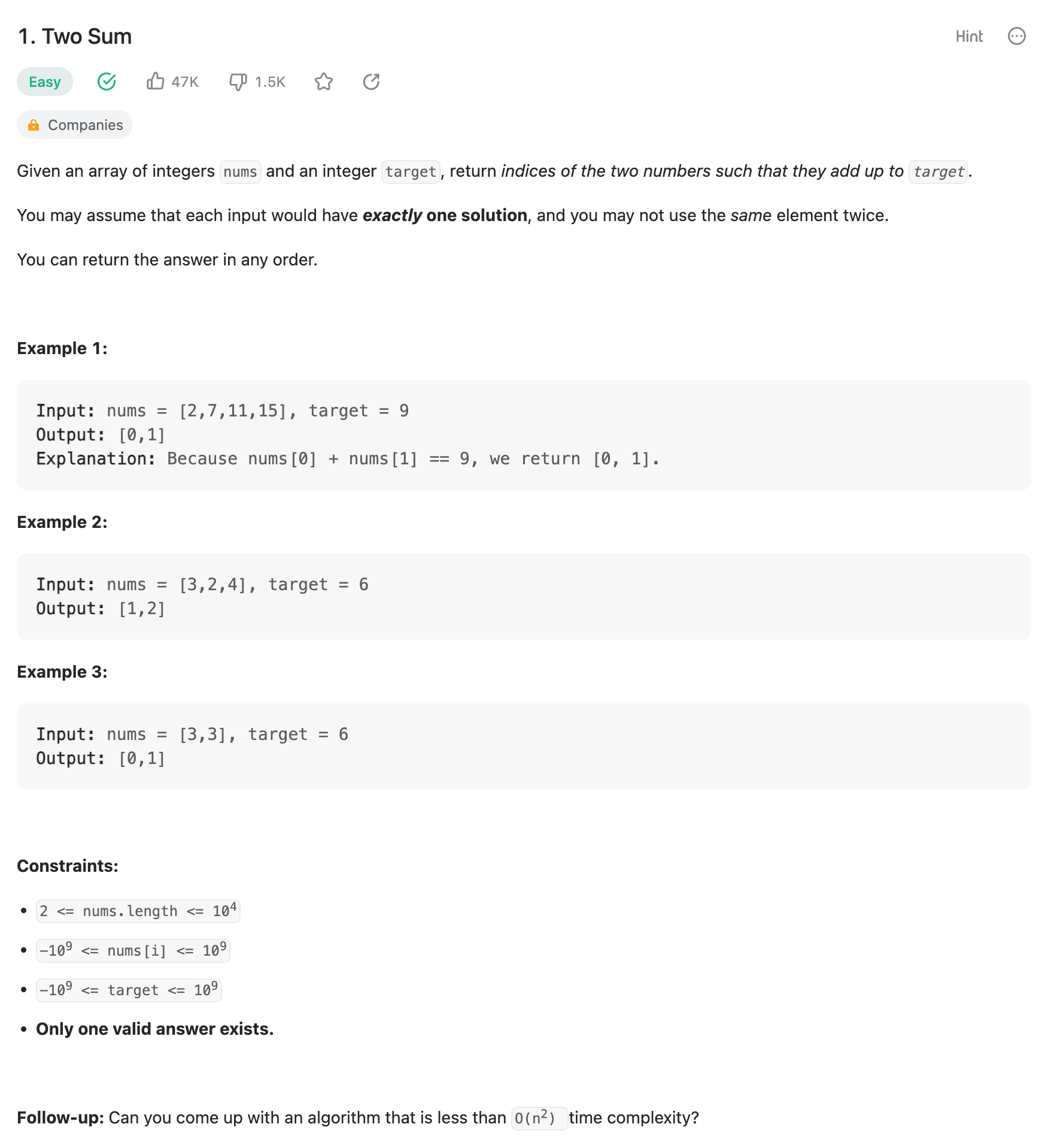 - nums 와 target이 주어졌을때, 두 원소를 더한 값이 target이 되는 nums의 index를 반환