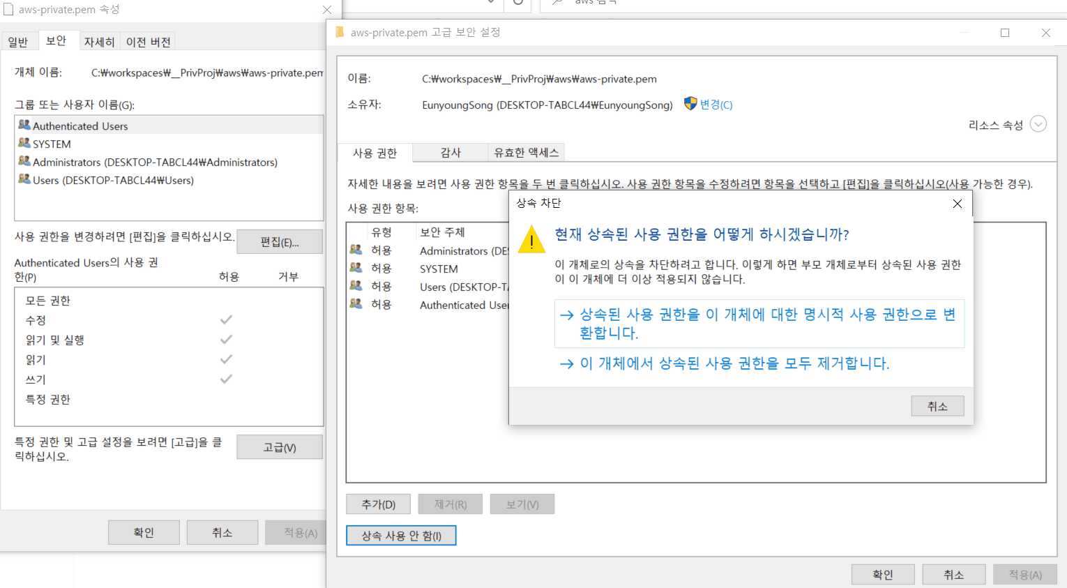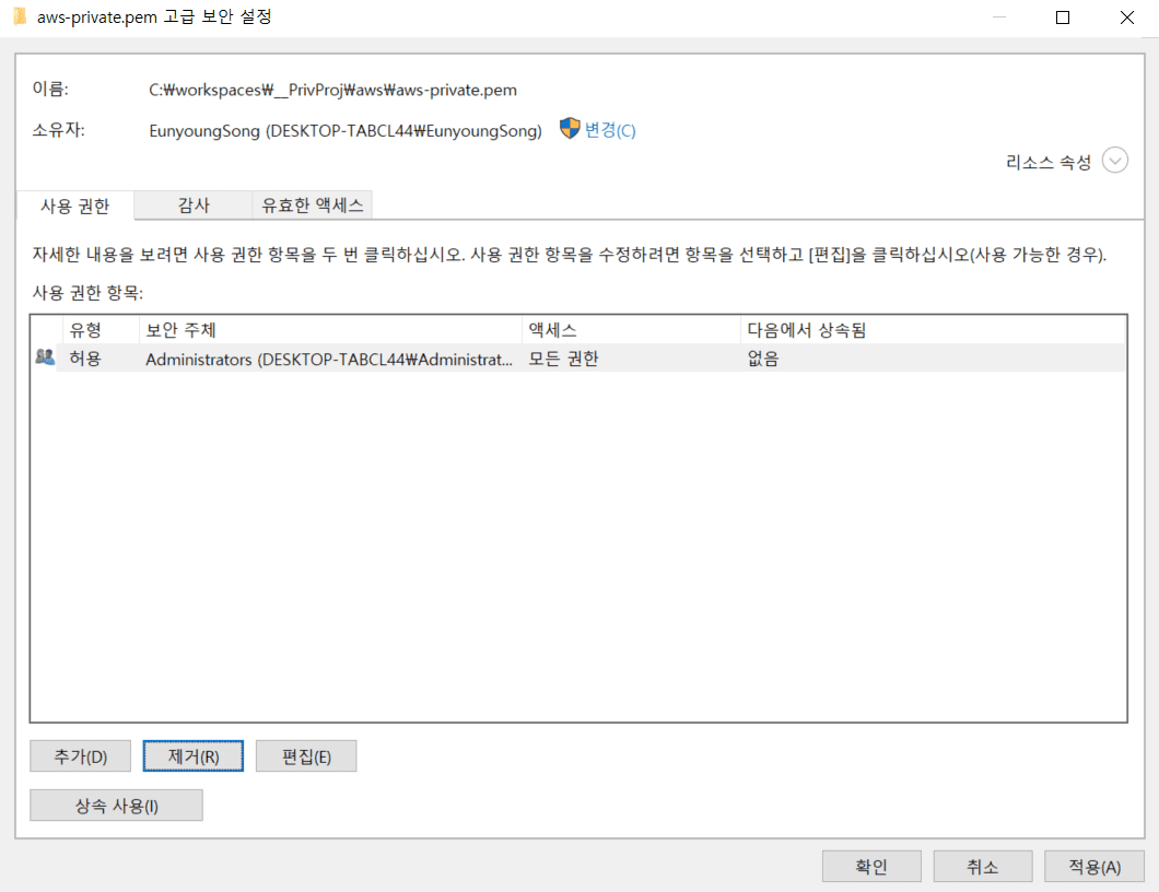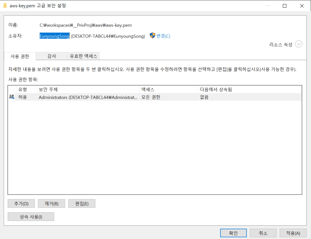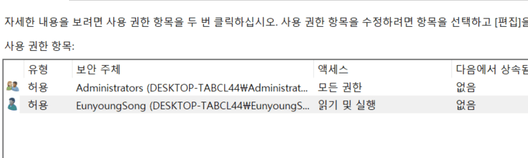 1. 속성 -> 보안 -> 고급에서 상속 사용안함 클릭 후 명시적 사용 권한으로 변경