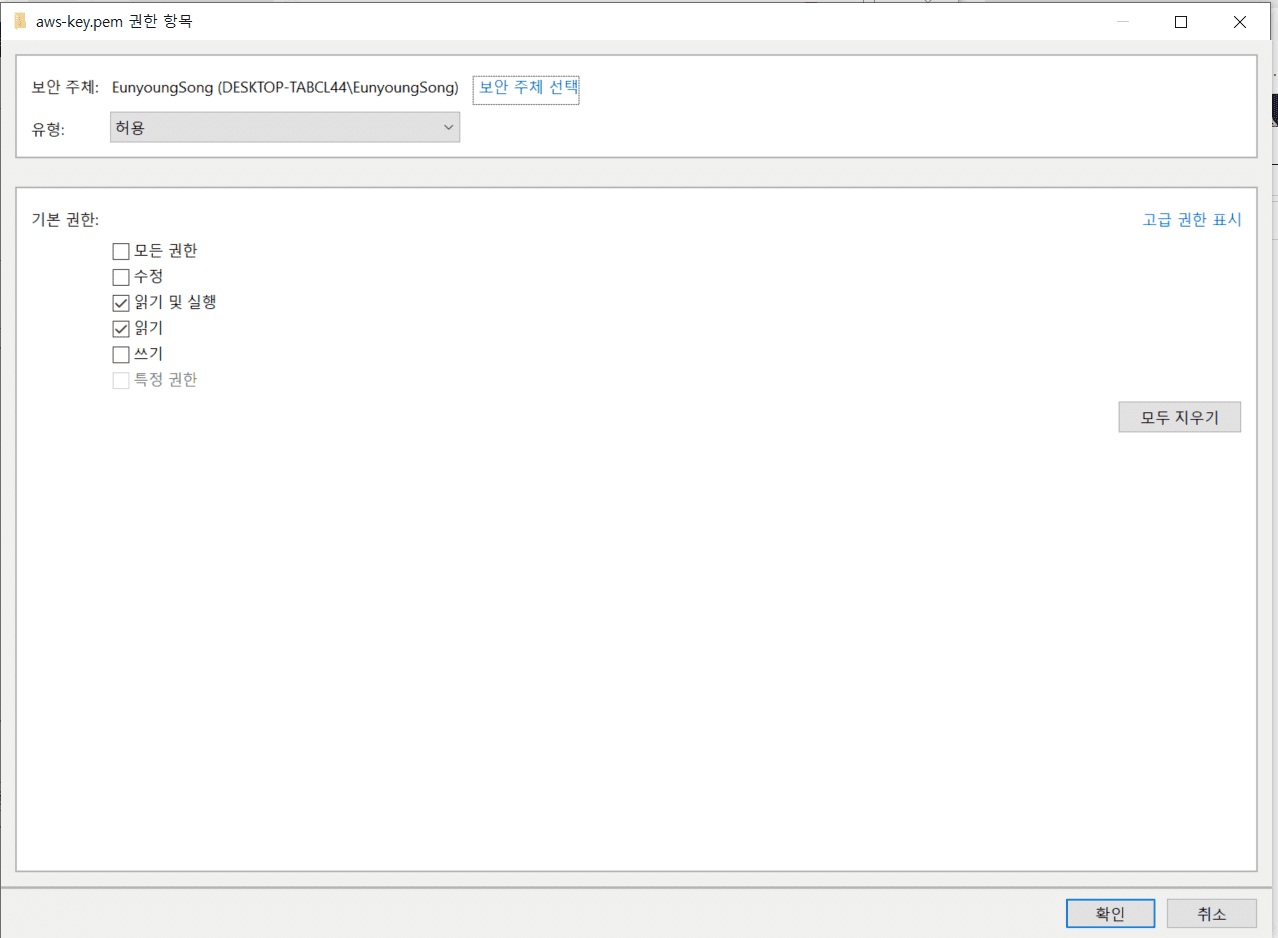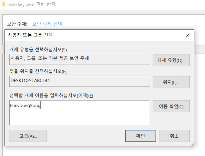 3. 소유자 복사 -> 추가 -> 보안주체 선택 -> 이름 입력 후 이름 확인