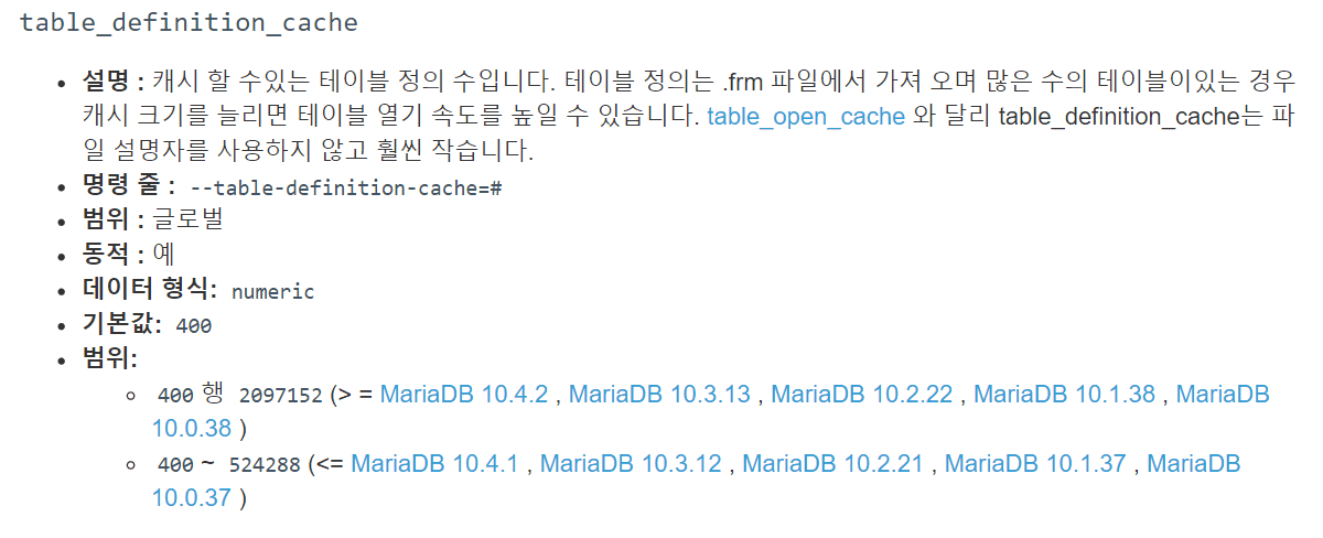 MariaDB [(none)]> SET GLOBAL table_definition_cache = 600; 변경방법2) my.cnf 수정