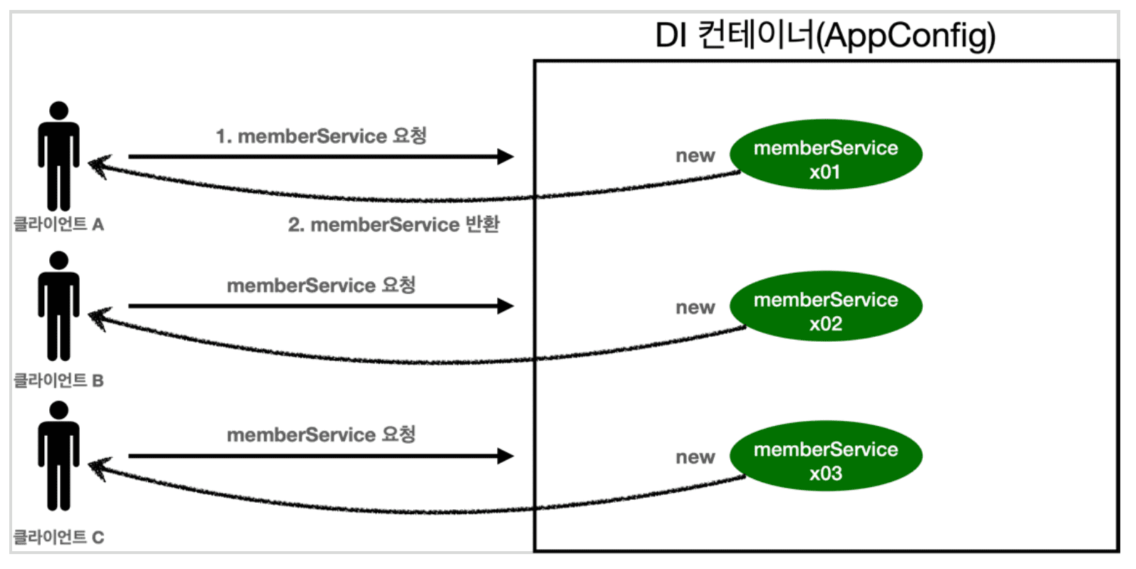 - 스프링 컨테이너는 싱글톤 컨테이너 역할을 한다.