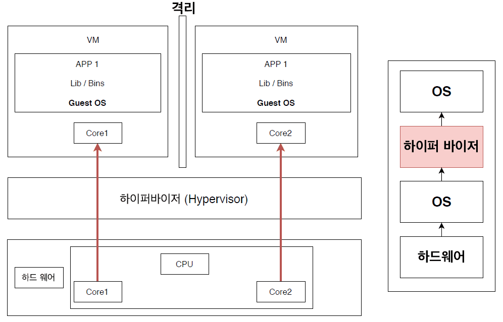 하이퍼바이저에 의해 구동되는 VM은 각 VM마다 독립된 가상 하드웨어 자원을 할당받는다.