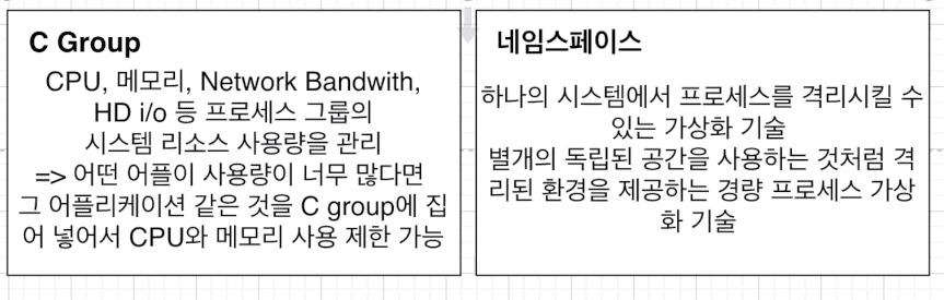 컨테이너와 호스트에서 실행되는 다른 프로세스 사이에 벽을 만드는 리눅스 커널 기능인 Cgroup과 네임스페이스를 사용