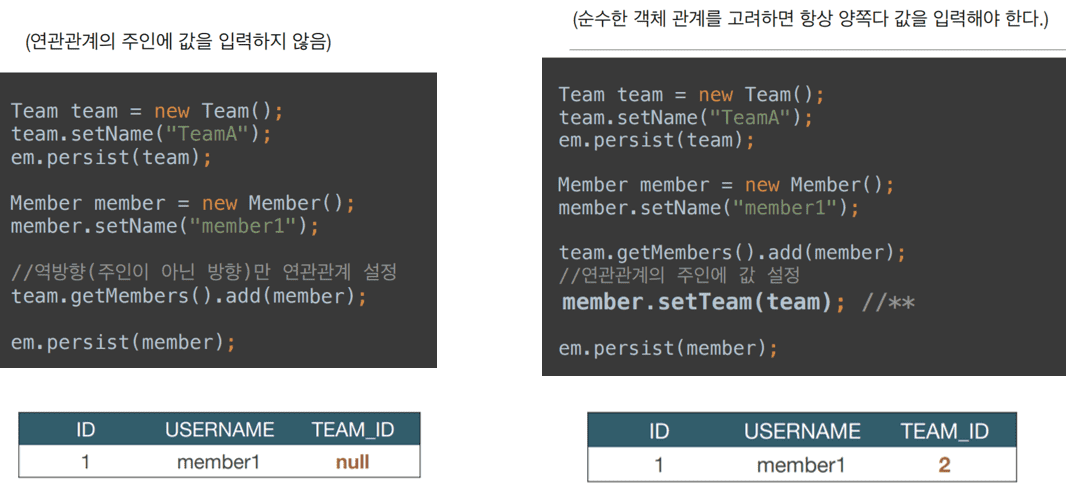 - 연관관계의 주인은 외래키의 위치를 기준으로 정해야함