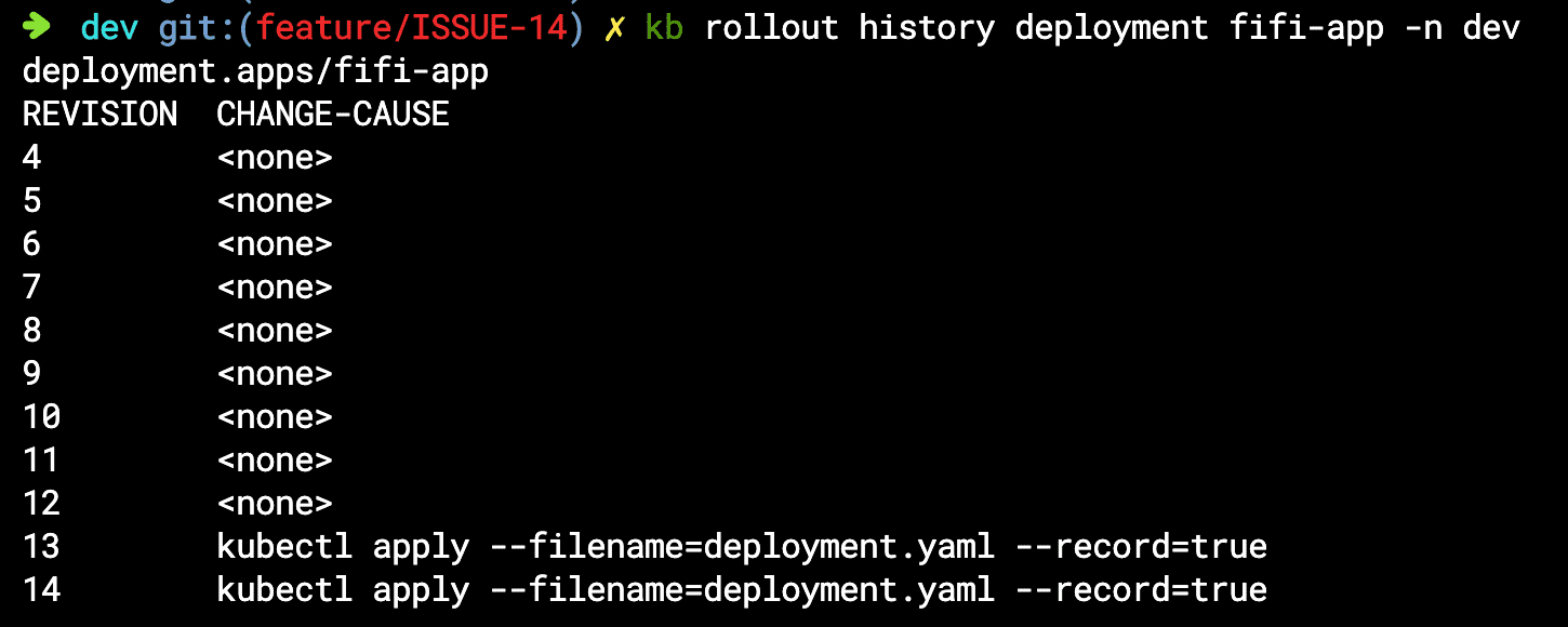 $ kubectl rollout undo deployment fifi-app -n dev