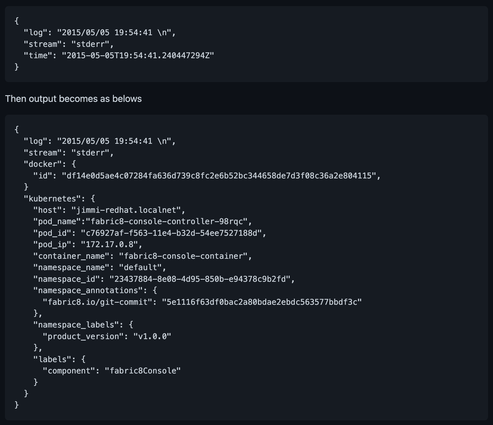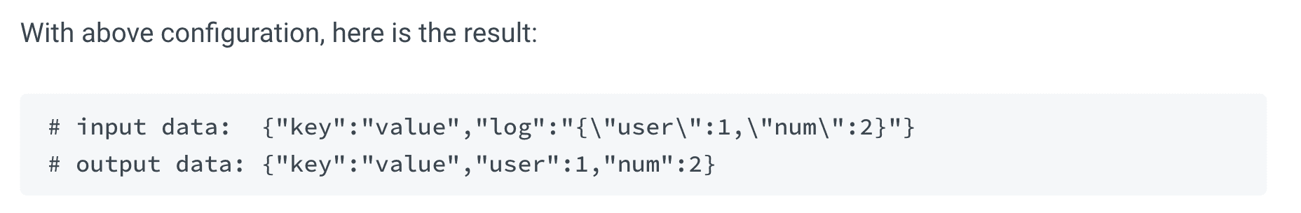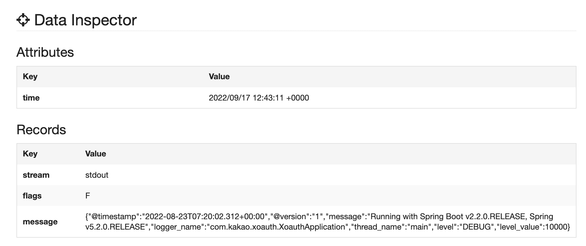 </source>2022-08-23T16:20:02.313036458+09:00 stdout F {"@timestamp":"2022-08-23T07:20:02.312+00:00","@version":"1","message":"Running with Spring Boot v2.2.0.RELEASE, Spring v5.2.0.RELEASE","logger_name":"com.kakao.xoauth.XoauthApplication","thread_name":"main","level":"DEBUG","level_value":10000}<parse> 의 regexp 를 통해 아래와 같이 파싱이 된다.