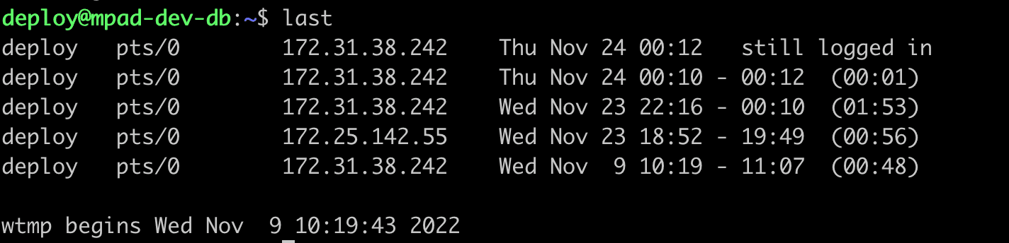 $ last$ last root# 시간 포맷: YYYYMMDDHHMMSS