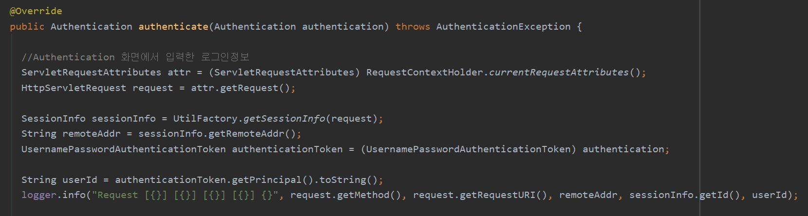 모든 req/res DB 로깅은 interceptor 에서 진행하였고, 로그인/ 로그아웃에 대한 req/res 로깅은 AuthenticationProvider 클래스를 구현한 곳에서 로깅을 하였는데, 로그인 로그아웃에 대한 로깅 위치에 대한 의문을 가지게 되었다.