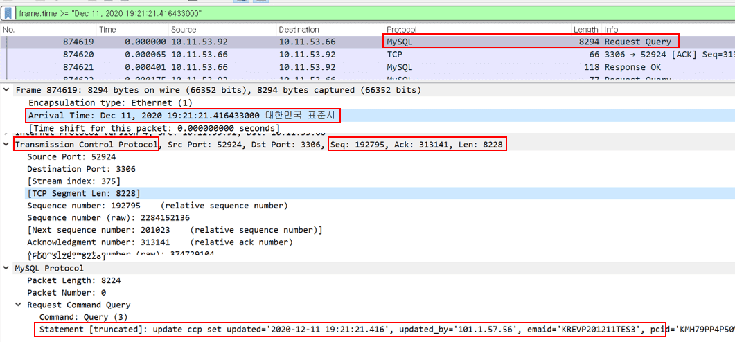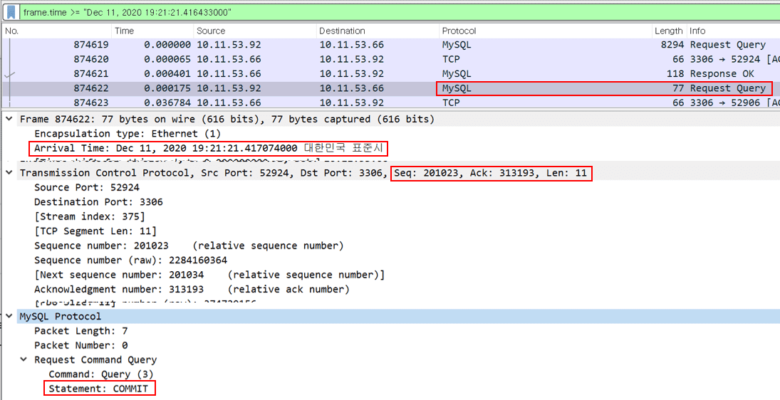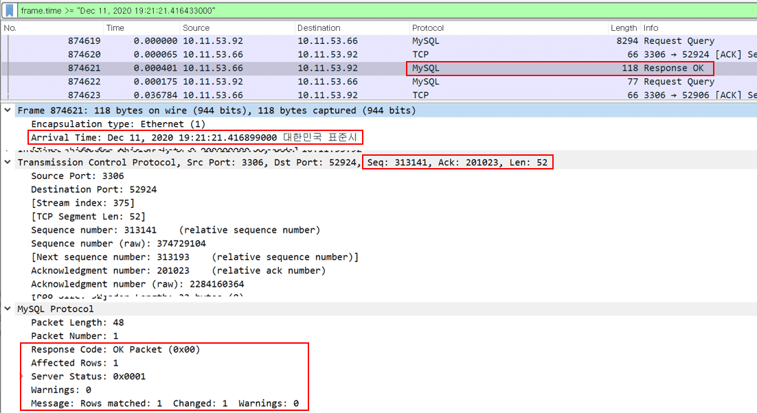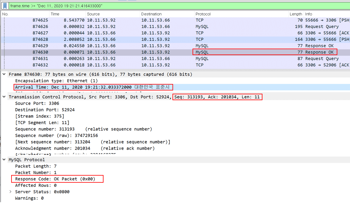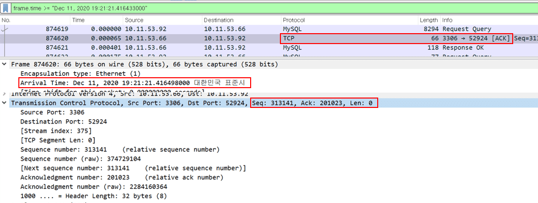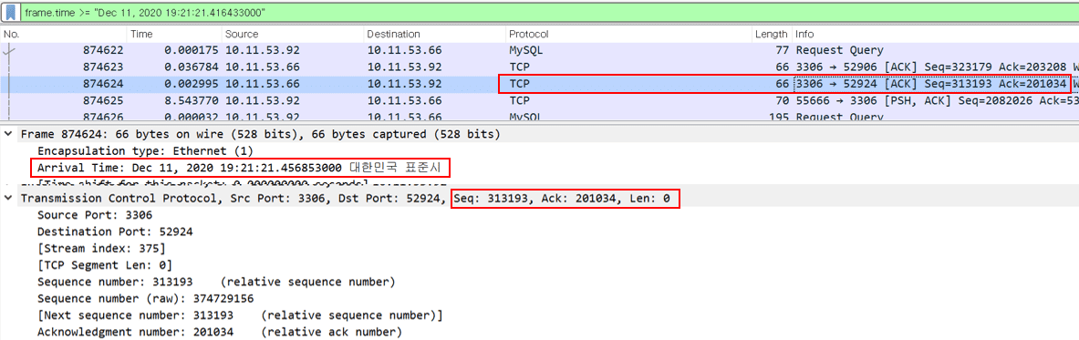 해당 부분이 솔루션 문제인지, 네트워크 문제인지 DB 문제인지 확인을 위해 tcpdump를 분석하였다.