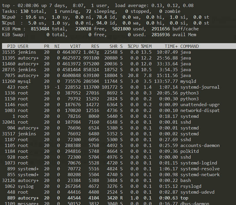[COMMAND] : 실행된 명령어[SHIFT + M] : 메모리 사용률 정렬