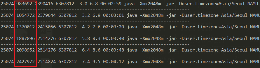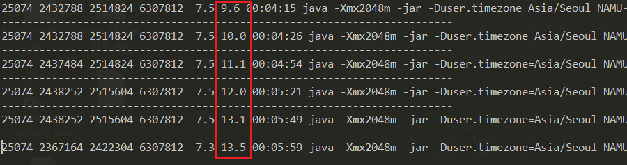 당시, 해당 프로세스의 메모리 사용량이 8G를 넘고 있었고(평균 1G), CPU 사용량도 90% 이상이 넘고 있었다.