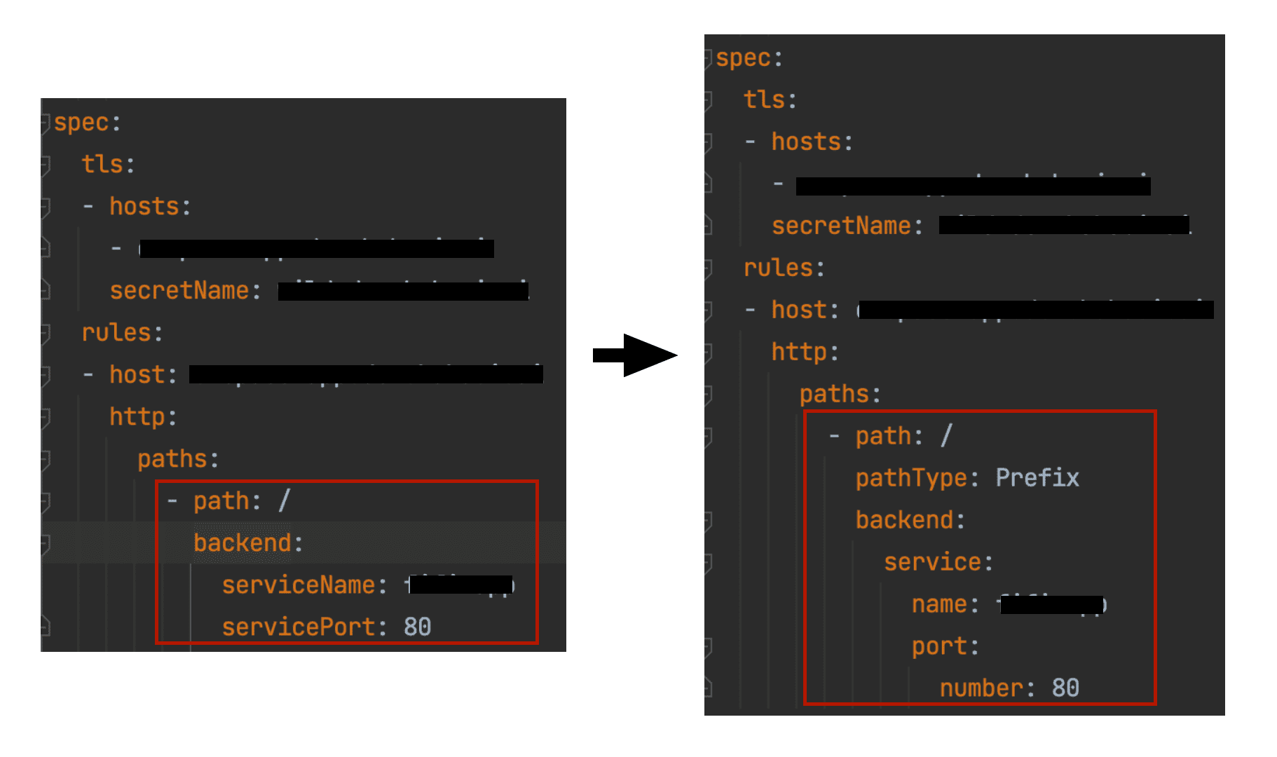ingress apiVersion 변경 후에 다시 apply를 하니 serviceName, servicePort 필드를 해석할 수 없다는 오류가 발생하였다.