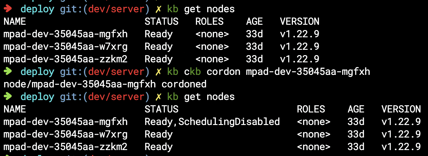 $ kubectl cordon [노드명]노드에 cordon 을 걸면 노드의 상태가 ScheduleingDisabled 가 된 것을 확인할 수 있다.