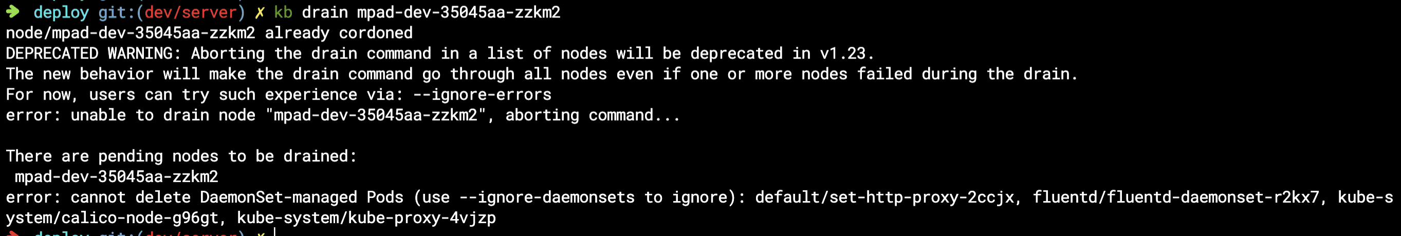 보통은 로깅, proxy, 네트웍 관련 데몬셋은 떠있기 때문에 꼭 --ignore-daemonsets 옵션을 주고 실행을 한다.