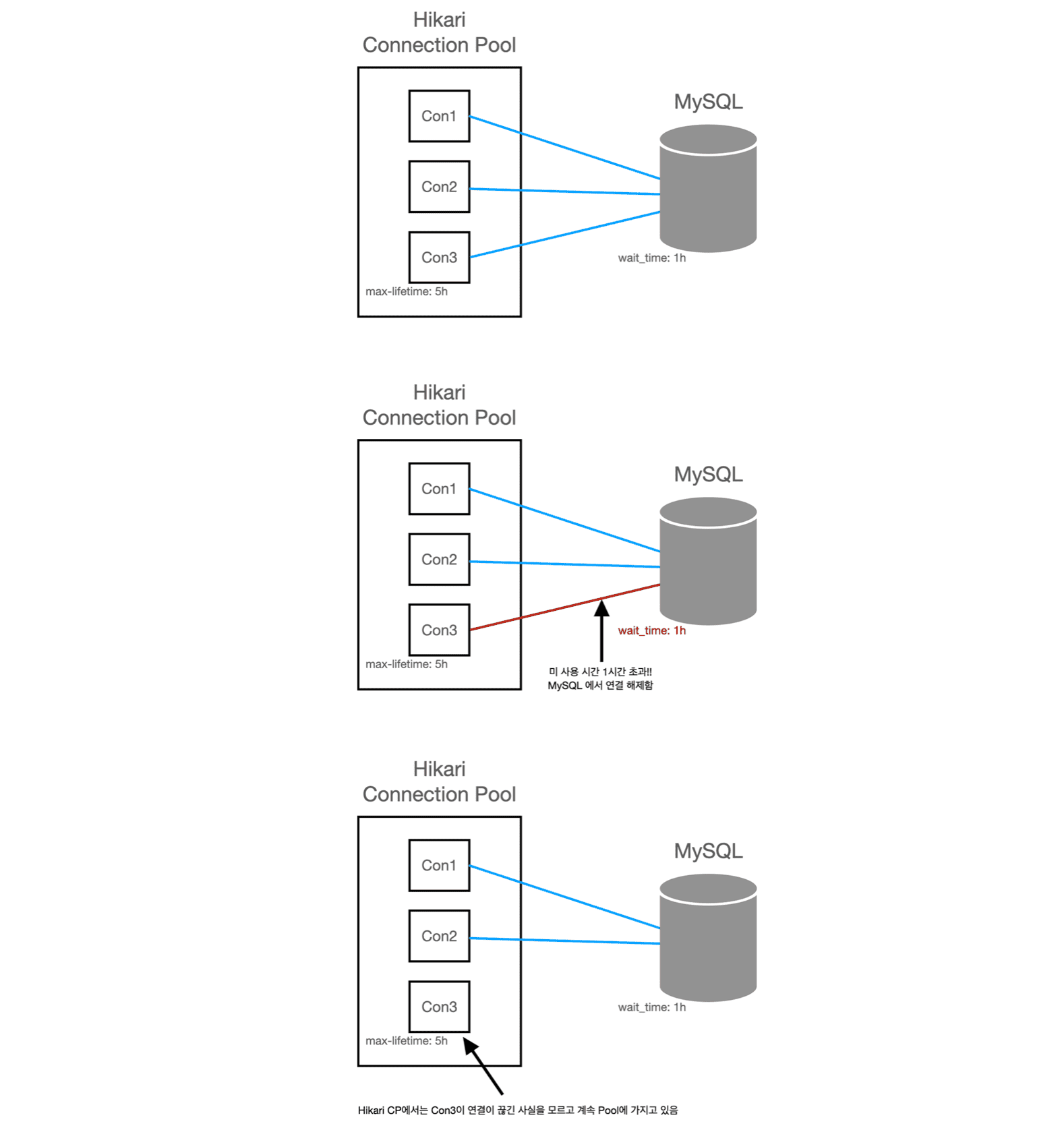 왜냐면, wait_time 시간이 지난 커넥션들은 DB서버에서 먼저 연결을 끊기 때문이다.