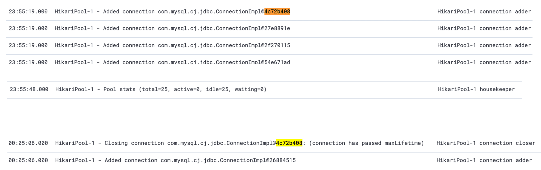 connection adder 스레드로 커넥션이 풀에 추가가 되었고, 00:05분에(10분 후) 해당 커넥션을 사용하지 않아 connection closer 스레드로 Closing 되었다.아니 그럼 대체 뭐가 문제인 것인가?? 뷁!