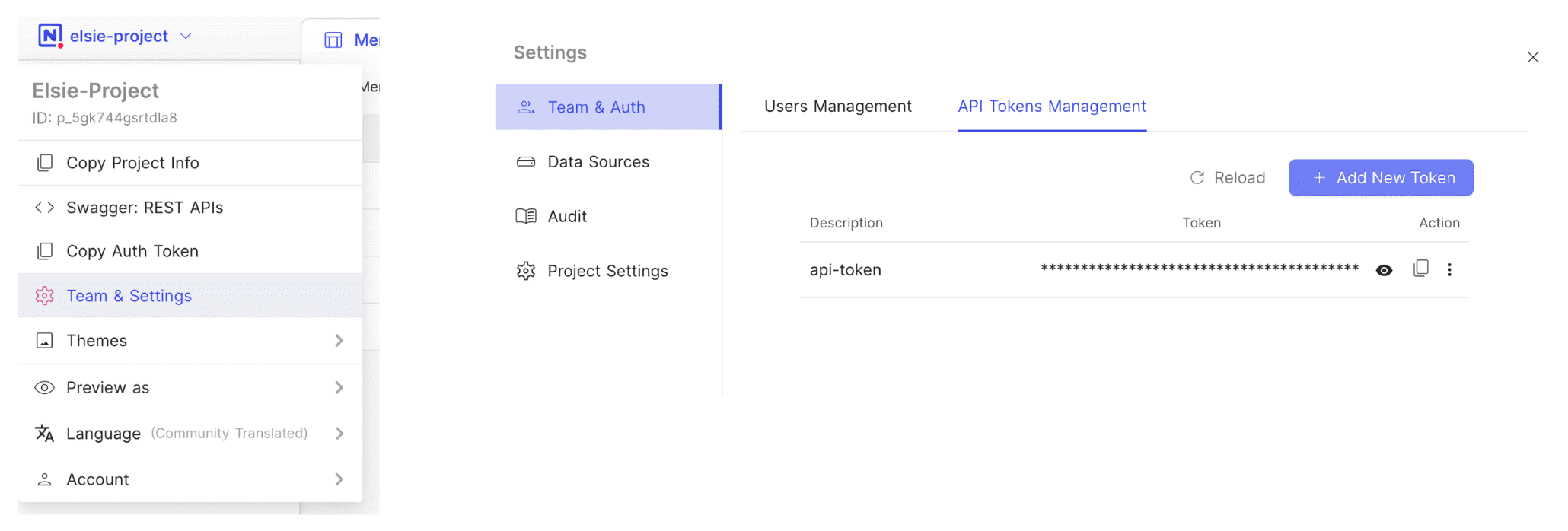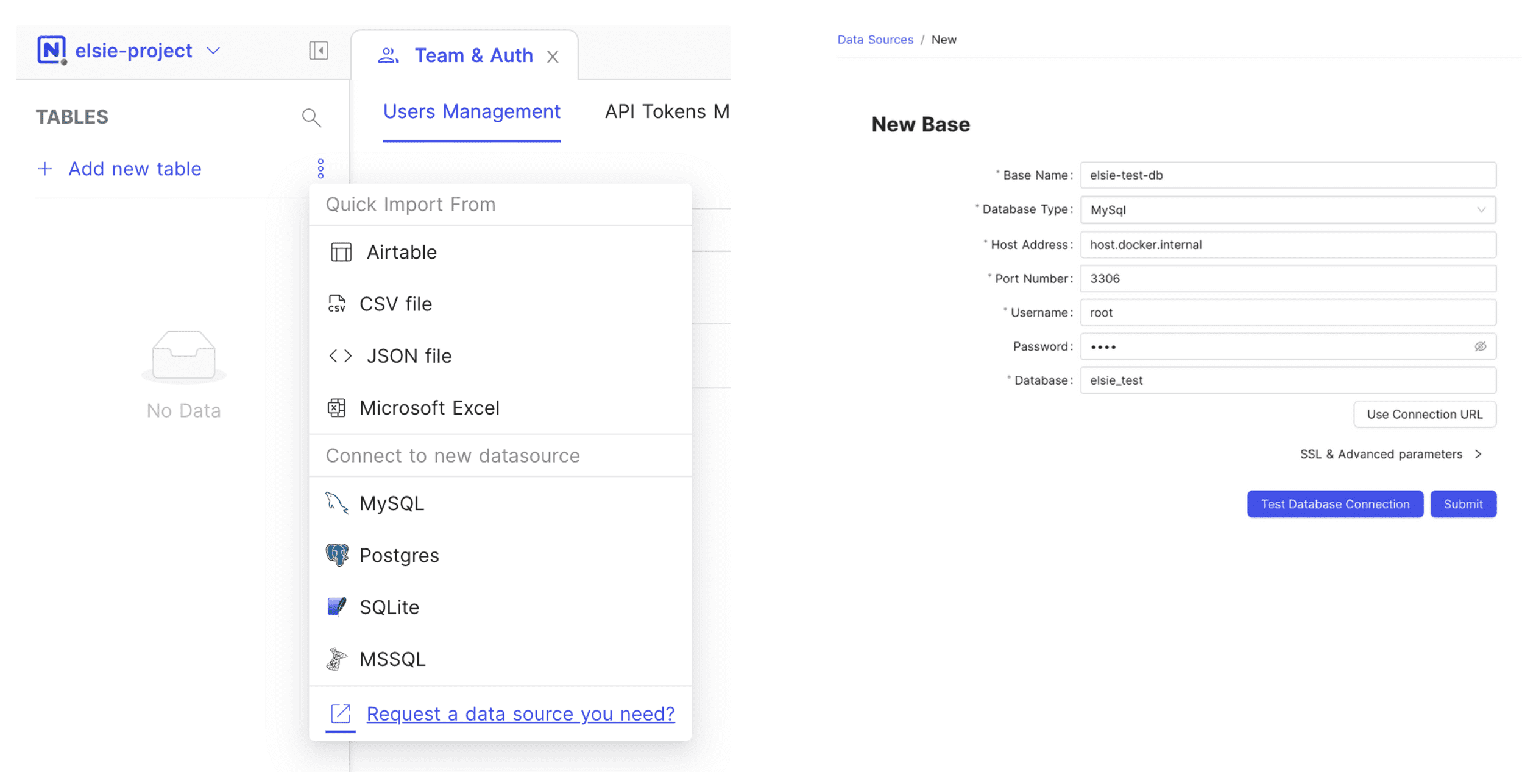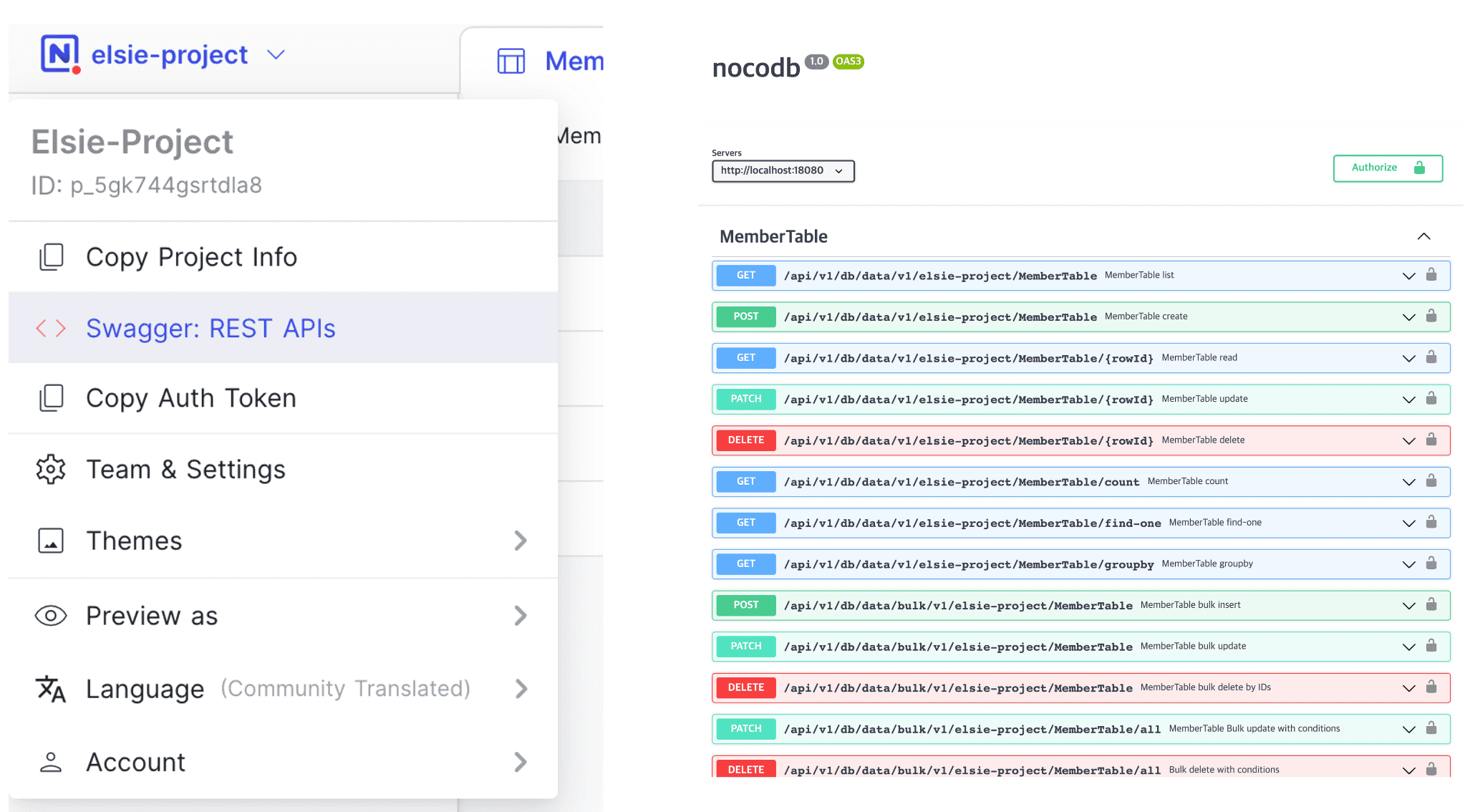 value: mysql2://localhost:3306?u=root&p=root&d=nocoNew Project 버튼을 클릭하여 project를 생성한다.Add new table 옆 three-dot 메뉴버튼을 클릭하면 connect to new datasource 항목에서 연결할 DB 종류를 선택한다.test database connection 버튼을 클릭하여 연결 확인 후 생성한다.Team & Auth 탭에서 사용자 생성 및 권한 부여를 할 수 있다.invite 버튼을 클릭하면 초대 url이 생성되며, 해당 url 을 통해 계정생성이 가능하다.swagger: REST APIs 버튼을 클릭하면 접속할 수 있다.Team & Settings → API Tokens Management 탭에서 token을 생성하여 사용하면 된다.Authorize 버튼 클릭 → xcToken 에 붙여넣기 → Authorize 버튼 클릭을 하여 사용한다.curl -X 'GET' \