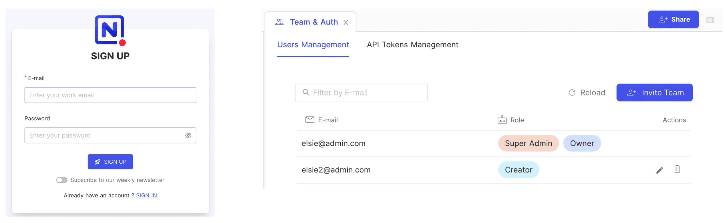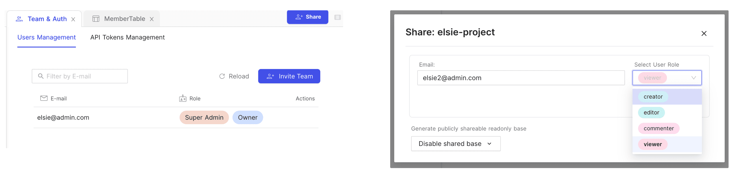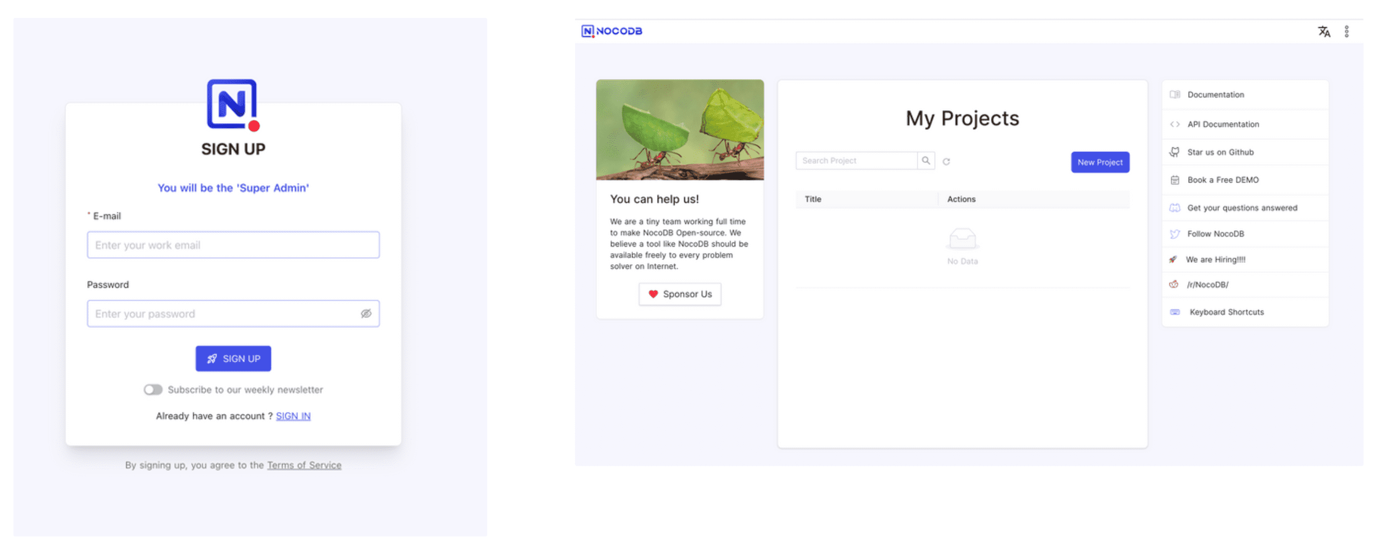 value: mysql2://localhost:3306?u=root&p=root&d=nocoNew Project 버튼을 클릭하여 project를 생성한다.Add new table 옆 three-dot 메뉴버튼을 클릭하면 connect to new datasource 항목에서 연결할 DB 종류를 선택한다.test database connection 버튼을 클릭하여 연결 확인 후 생성한다.Team & Auth 탭에서 사용자 생성 및 권한 부여를 할 수 있다.invite 버튼을 클릭하면 초대 url이 생성되며, 해당 url 을 통해 계정생성이 가능하다.swagger: REST APIs 버튼을 클릭하면 접속할 수 있다.Team & Settings → API Tokens Management 탭에서 token을 생성하여 사용하면 된다.Authorize 버튼 클릭 → xcToken 에 붙여넣기 → Authorize 버튼 클릭을 하여 사용한다.curl -X 'GET' \