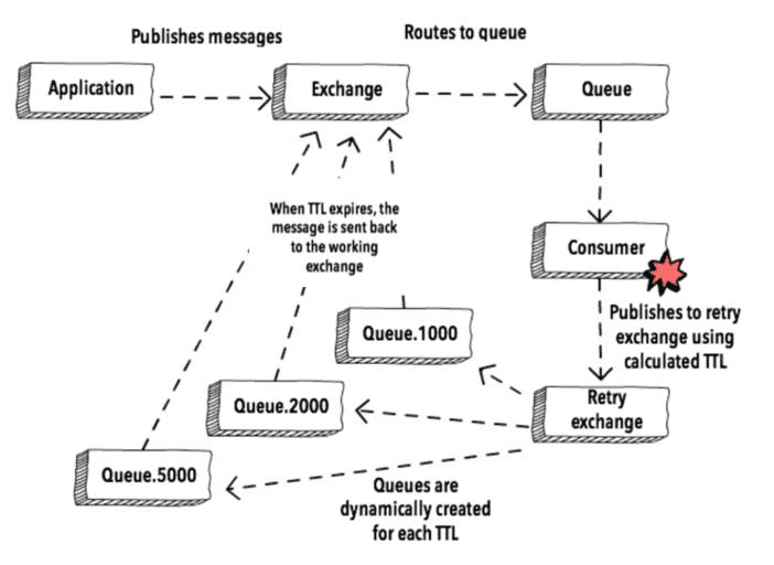 - TTL이 만료되면 backoff.x Exchange로 이동하게 되고, header 값에 저장되어 있는 작업 큐 이름을 확인하여 해당 작업 큐로 requeue 된다.