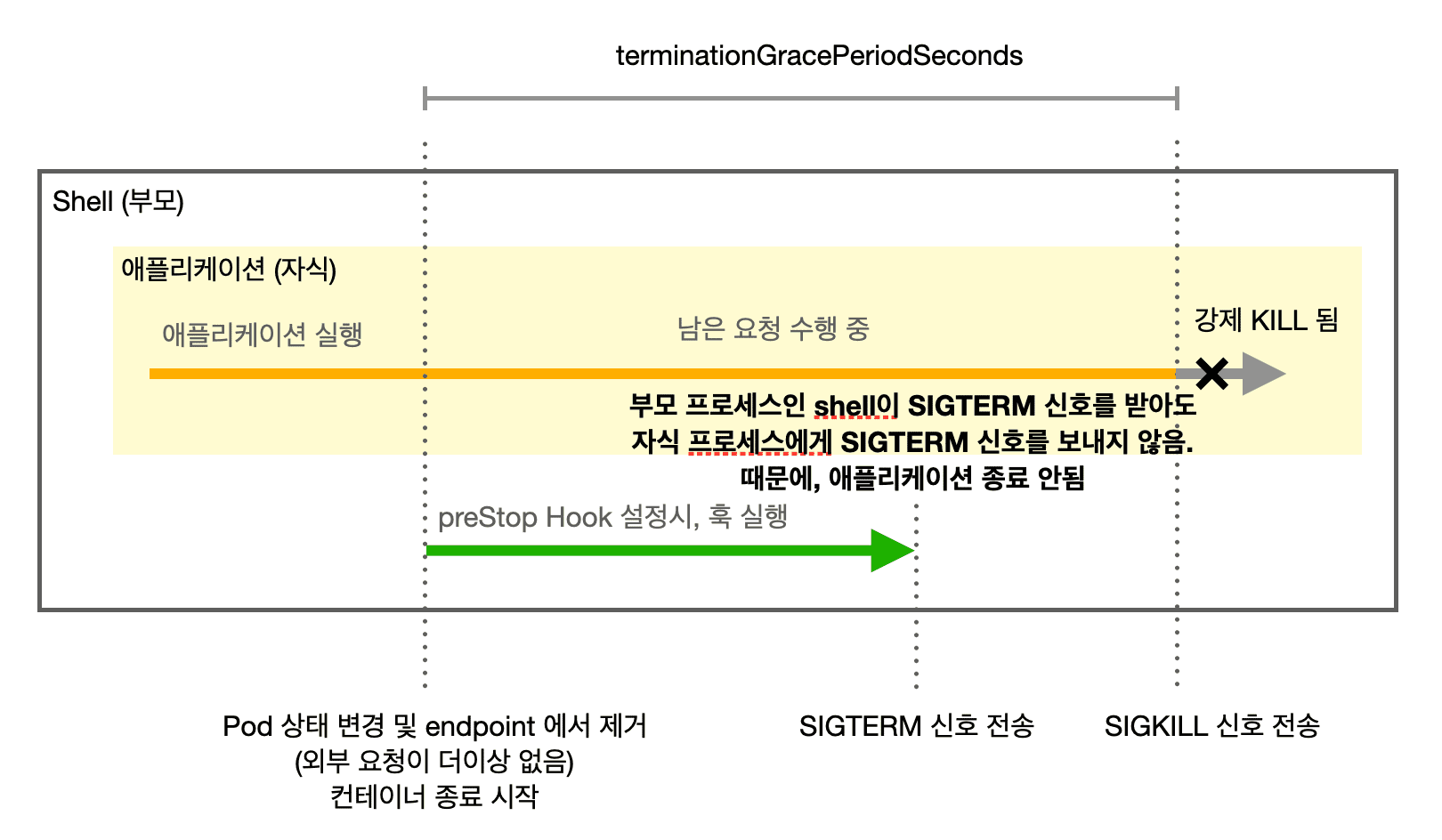 - kubelet이 SIGTERM 신호를 보내면 shell 프로세스에서 소비된다.