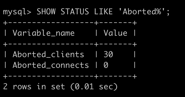 Aborted_clients: 클라이언트가 비정상적으로 종료되어 서버가 연결을 중단한 횟수