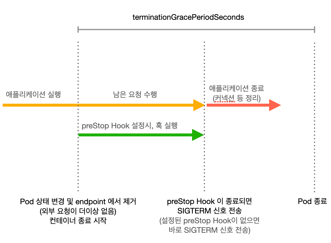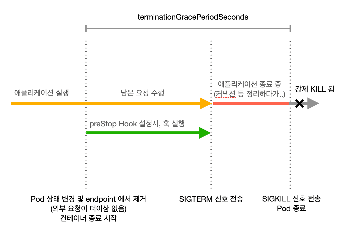 쿠버네티스를 사용을 한다면, 파드를 graceful 하게 종료시키기 위해 deployment 매니페스트에 preStop Hook, terminationGracePeriodSeconds 를 설정하곤 한다.