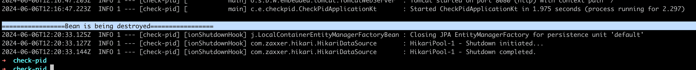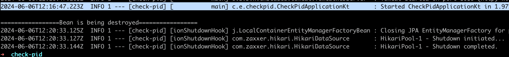 - start 로그 이후에 DB Pool이 정리되는 로그가 보인다.