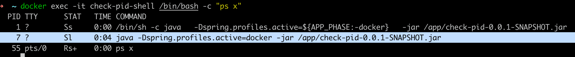 - 컨테이너 실행 후, PID 확인을 하면 java PID는 7 이고, 이를 수행하는 /bin/sh 이 PID 1 이다.