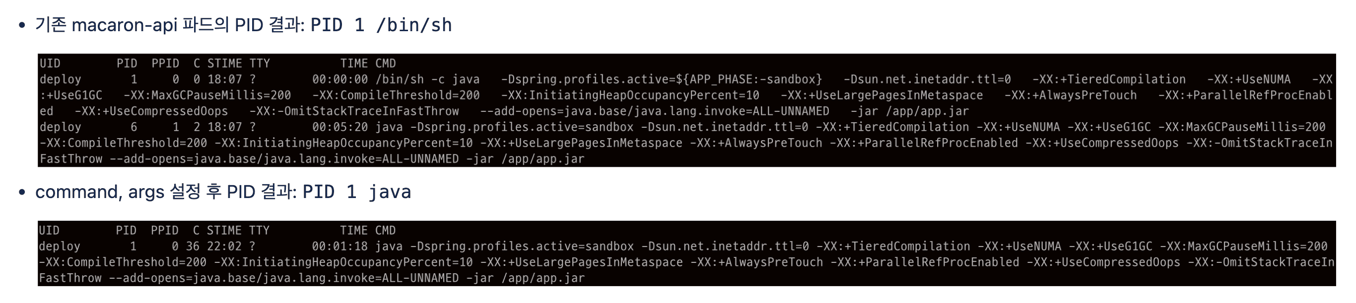 kubelet에서 SIGTERM 신호를 보내도 shell 이 받아버려 Graceful Termination 을 위해 세팅되었던 K8S 설정들이 무의미 했다는걸 알게 되었다.