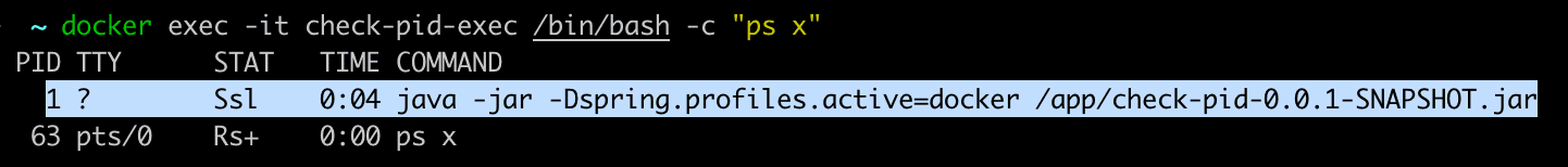 - 컨테이너 실행 후, PID 확인을 하면 java 가 PID 1 이다.